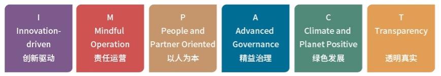復星的可持續發展戰略:「創造影響力」(Create IMPACT),確定了六大長期戰略方向,即:I: Innovation-driven創新驅動、M: Mindful Operation責任運營、P: People and Partner Oriented以人為本、A: Advanced Governance精益治理、C: Climate and Planet Positive綠色發展、T: Transparency透明真實,這是復星成立以來的初心延續,也是ESG實踐長期貫徹執行的保障。