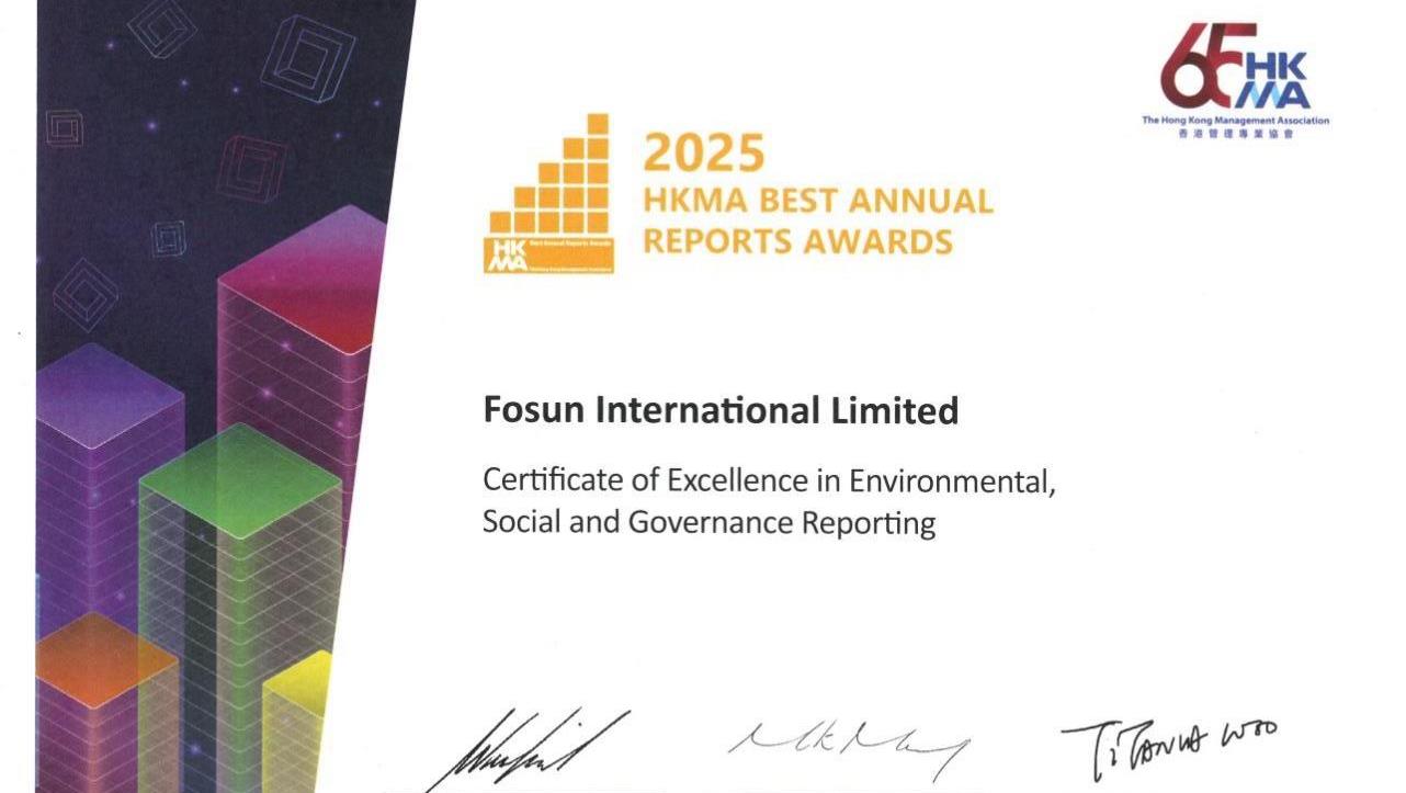 2026年2月23日,香港管理專業協會(HKMA)在香港舉辦「2025年度最佳年報大獎」頒獎典禮。復星國際榮獲「環境、社會及管治報告卓越獎」(Certificate of Excellence in Environmental, Social and Governance Reporting),彰顯公司在ESG策略、環境保護、社會責任、企業治理及信息披露等方面的優異表現持續獲得業內專業權威機構的高度認可。